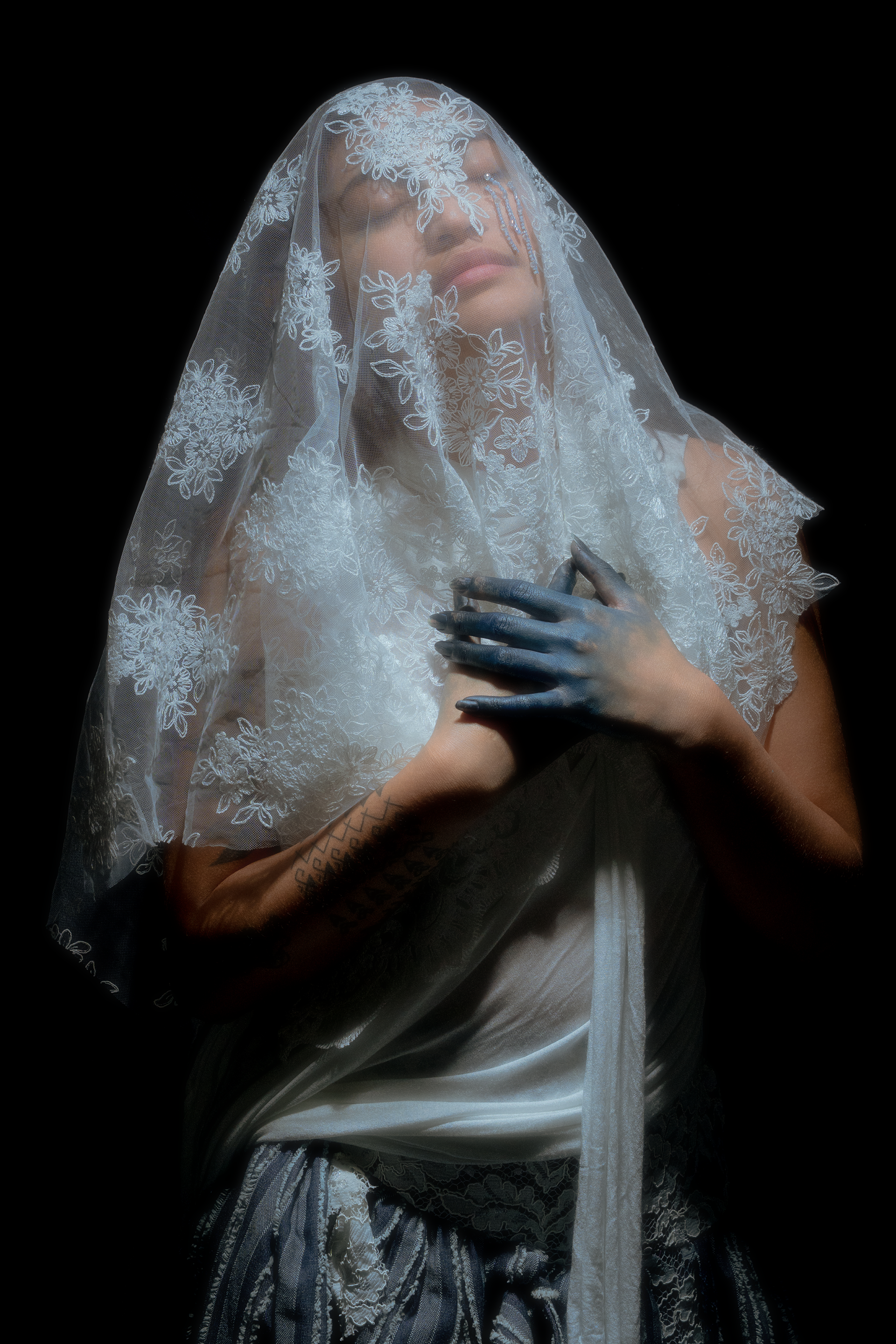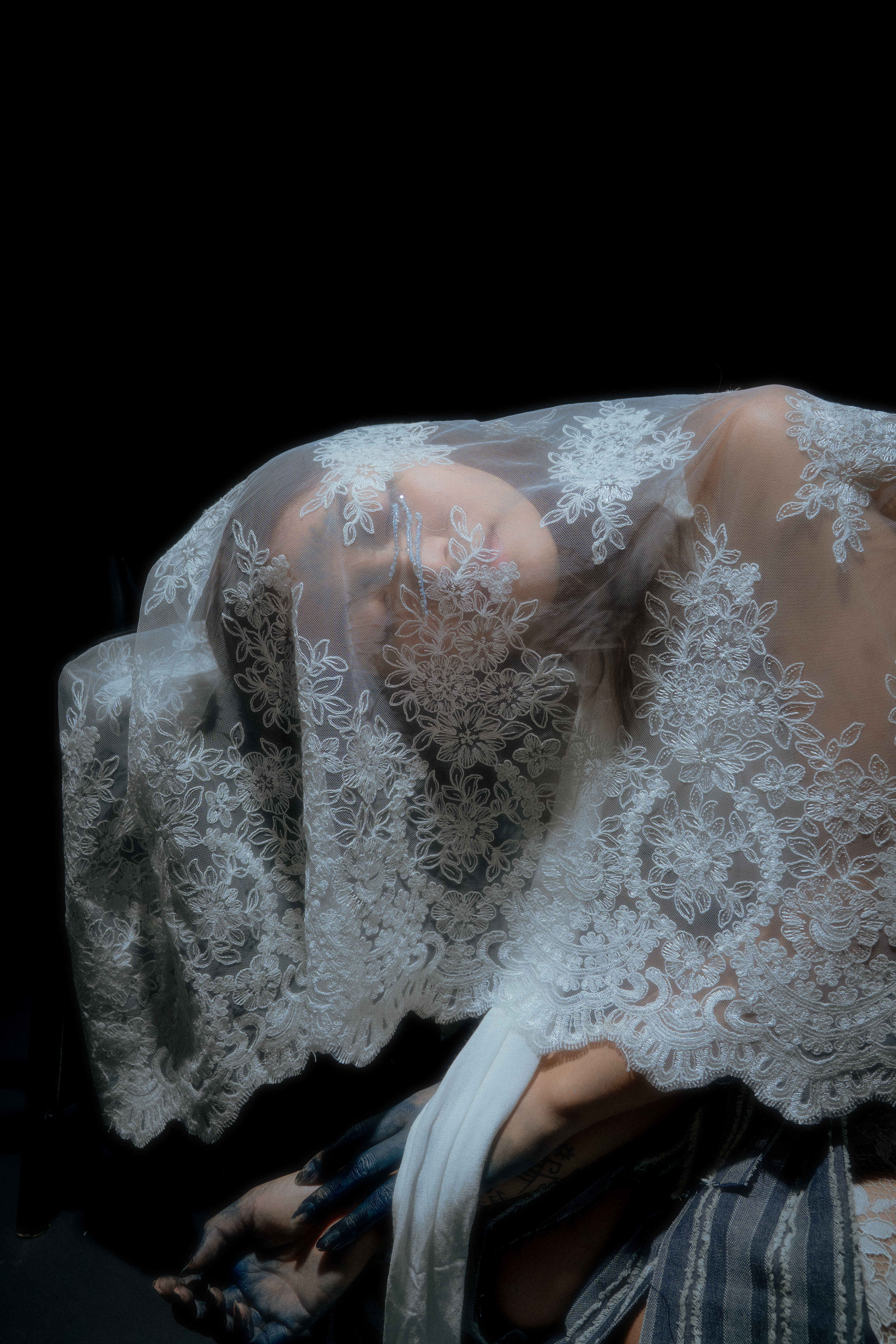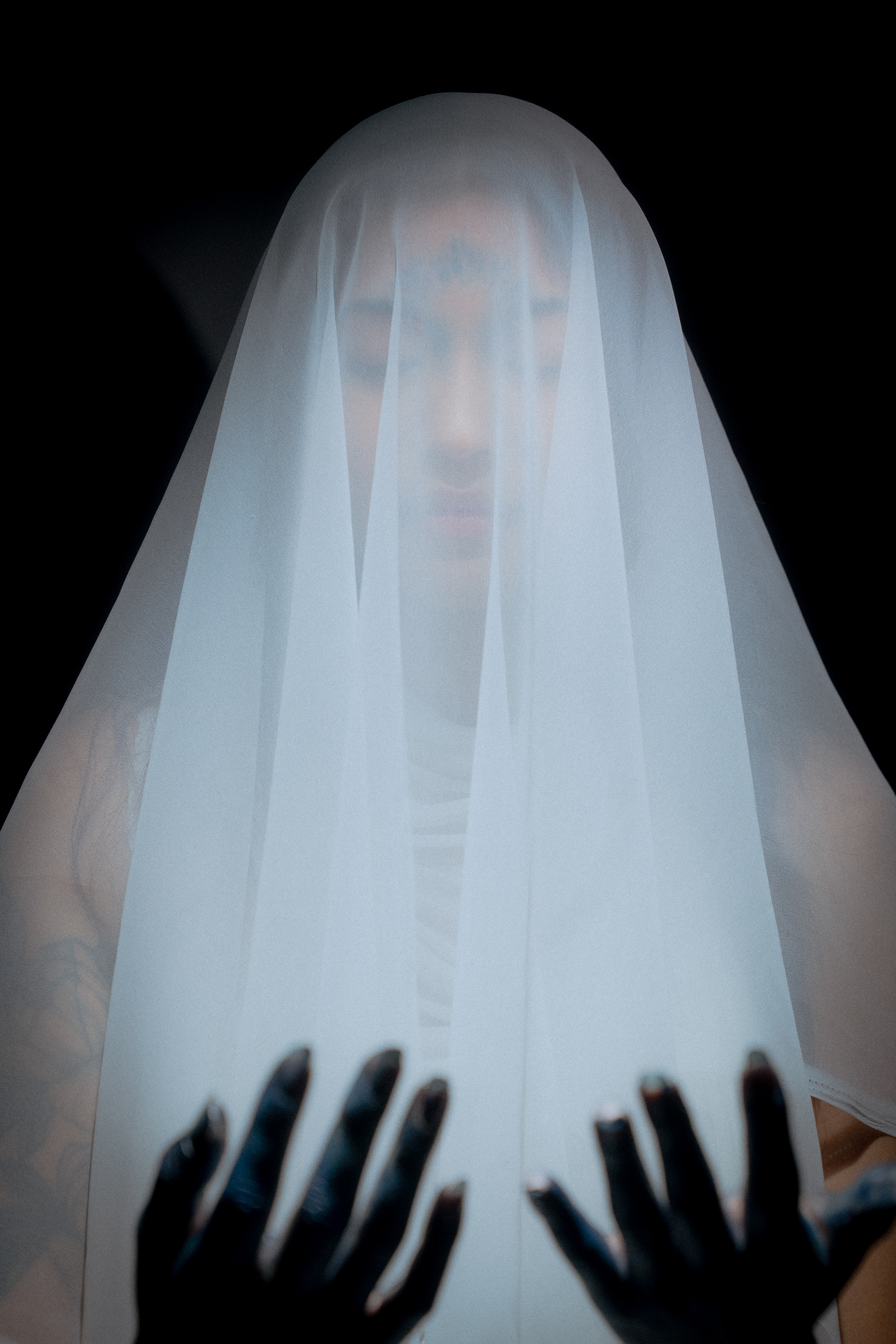 A reflection of acceptance and renewal -- the veil's beads symbolise tears, the overflowing of release, and self-acknowledgement. The expansive silhouette expresses softness, openness, and a quiet commitment back to oneself.