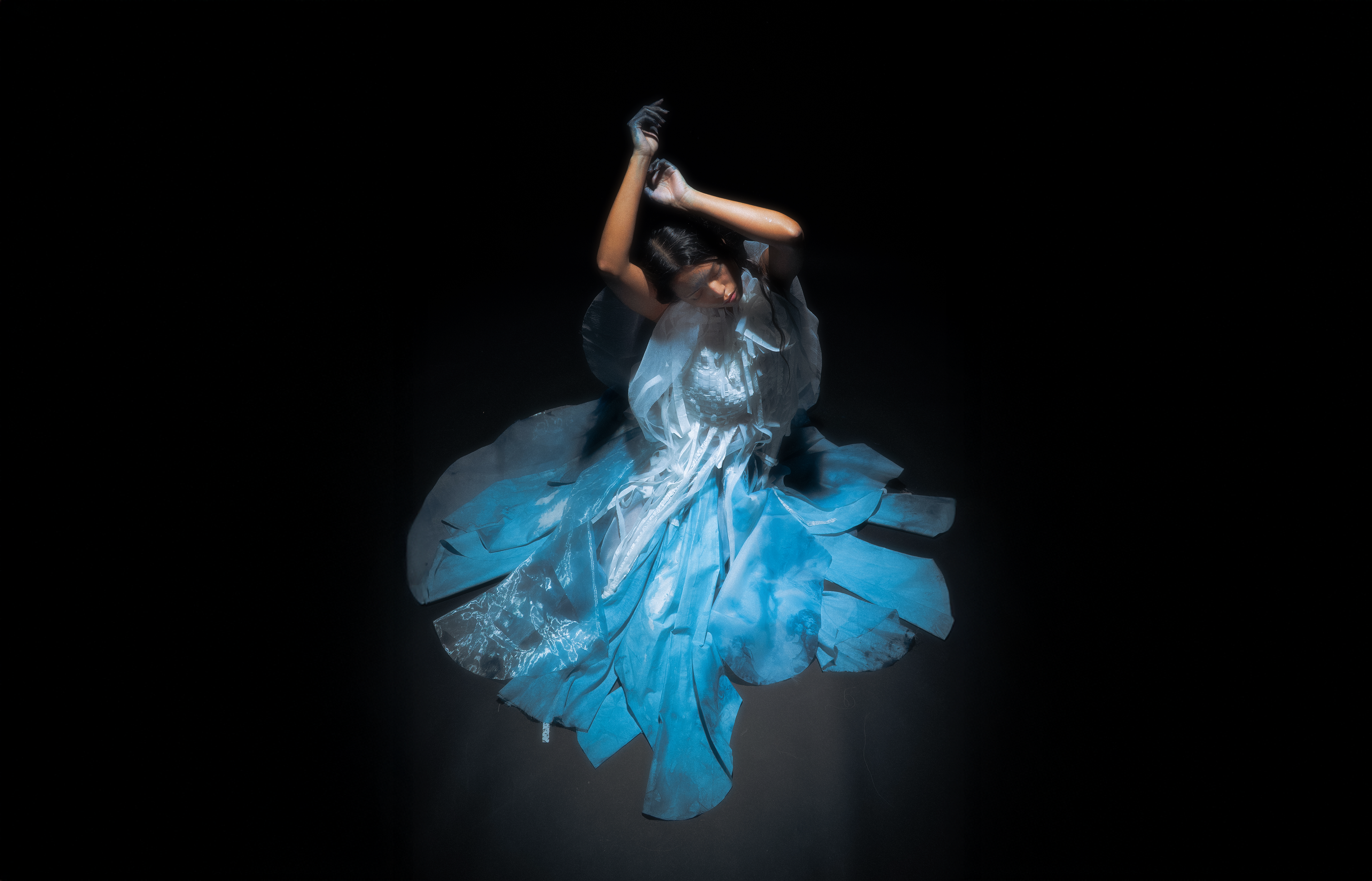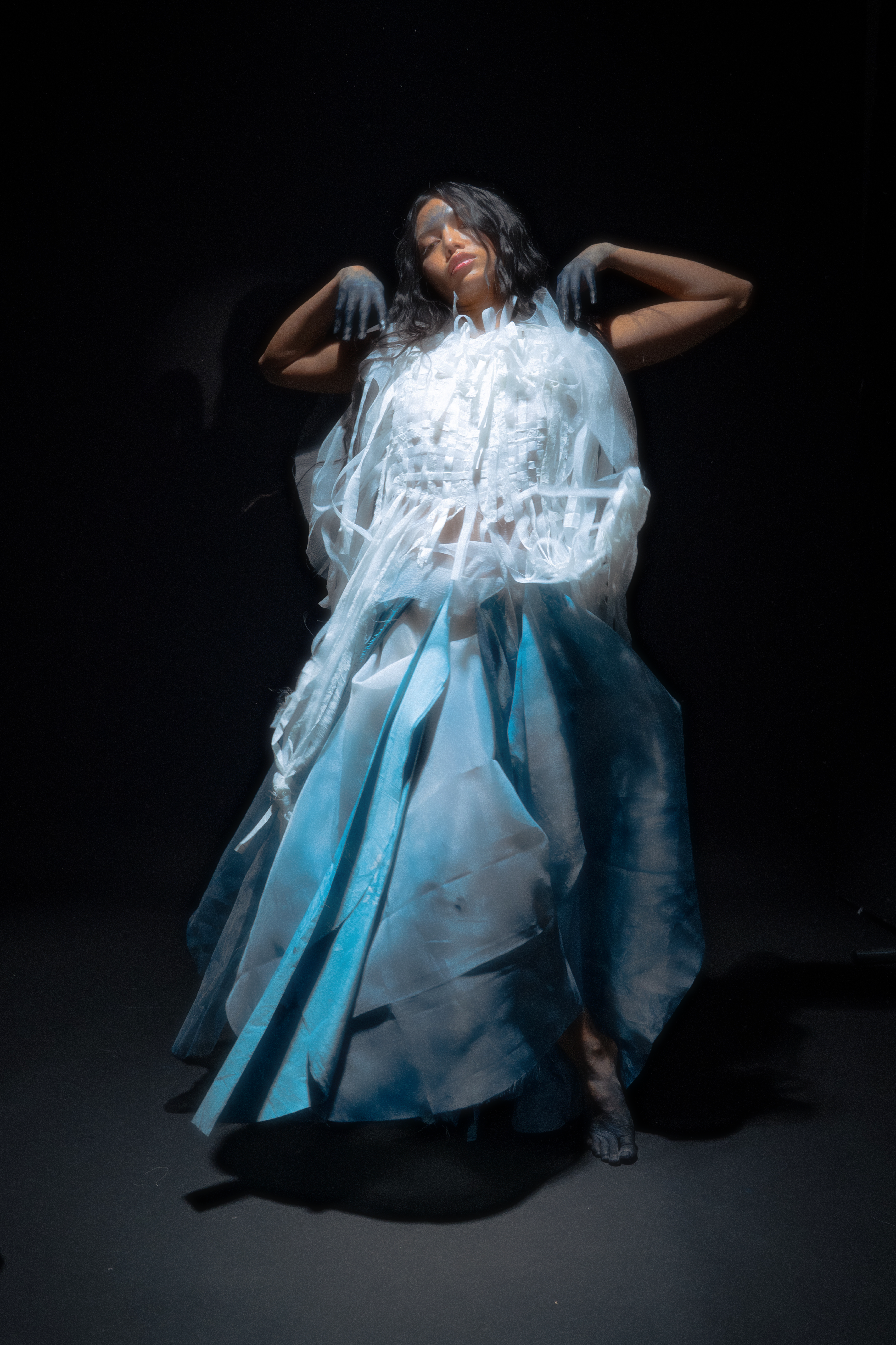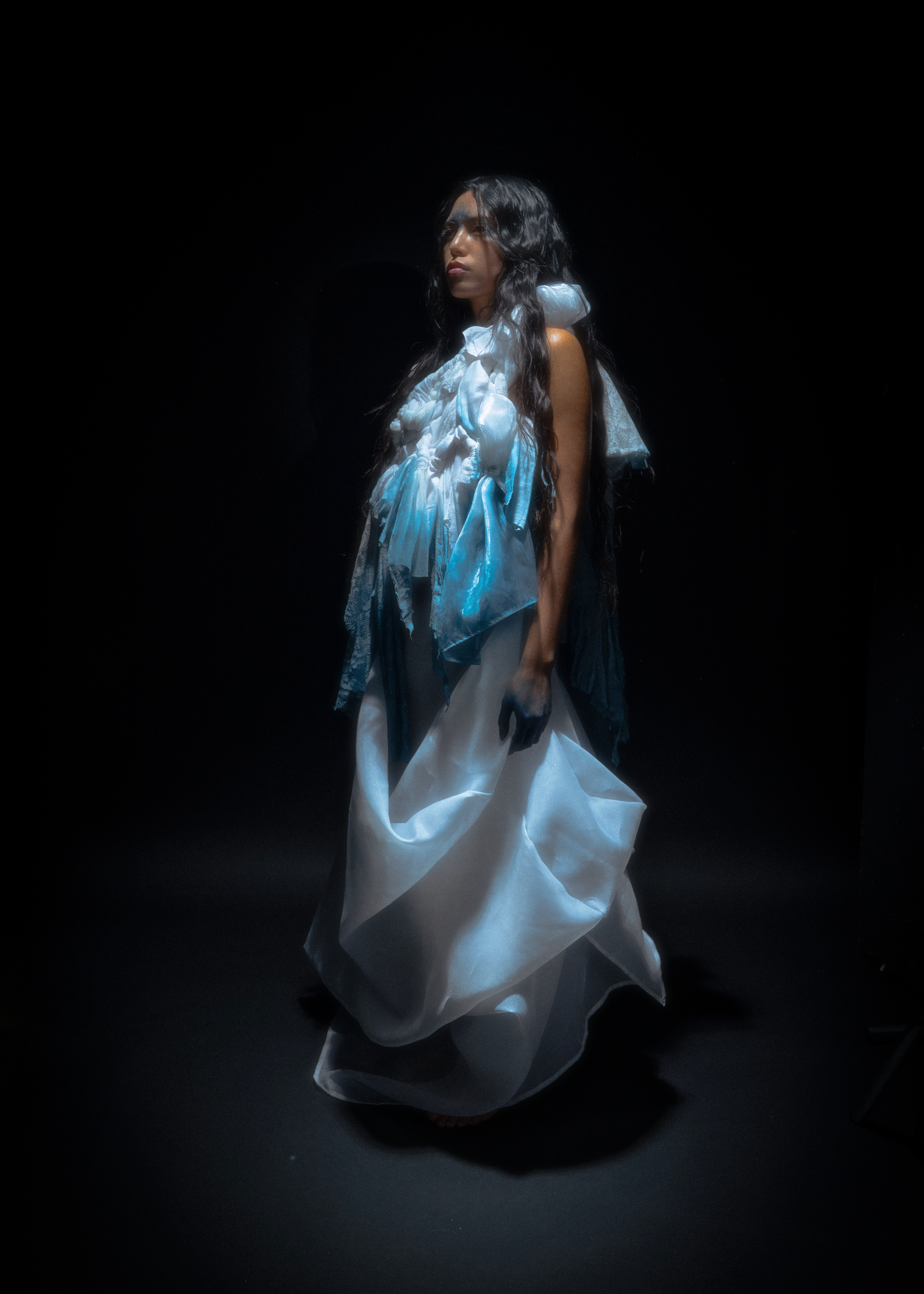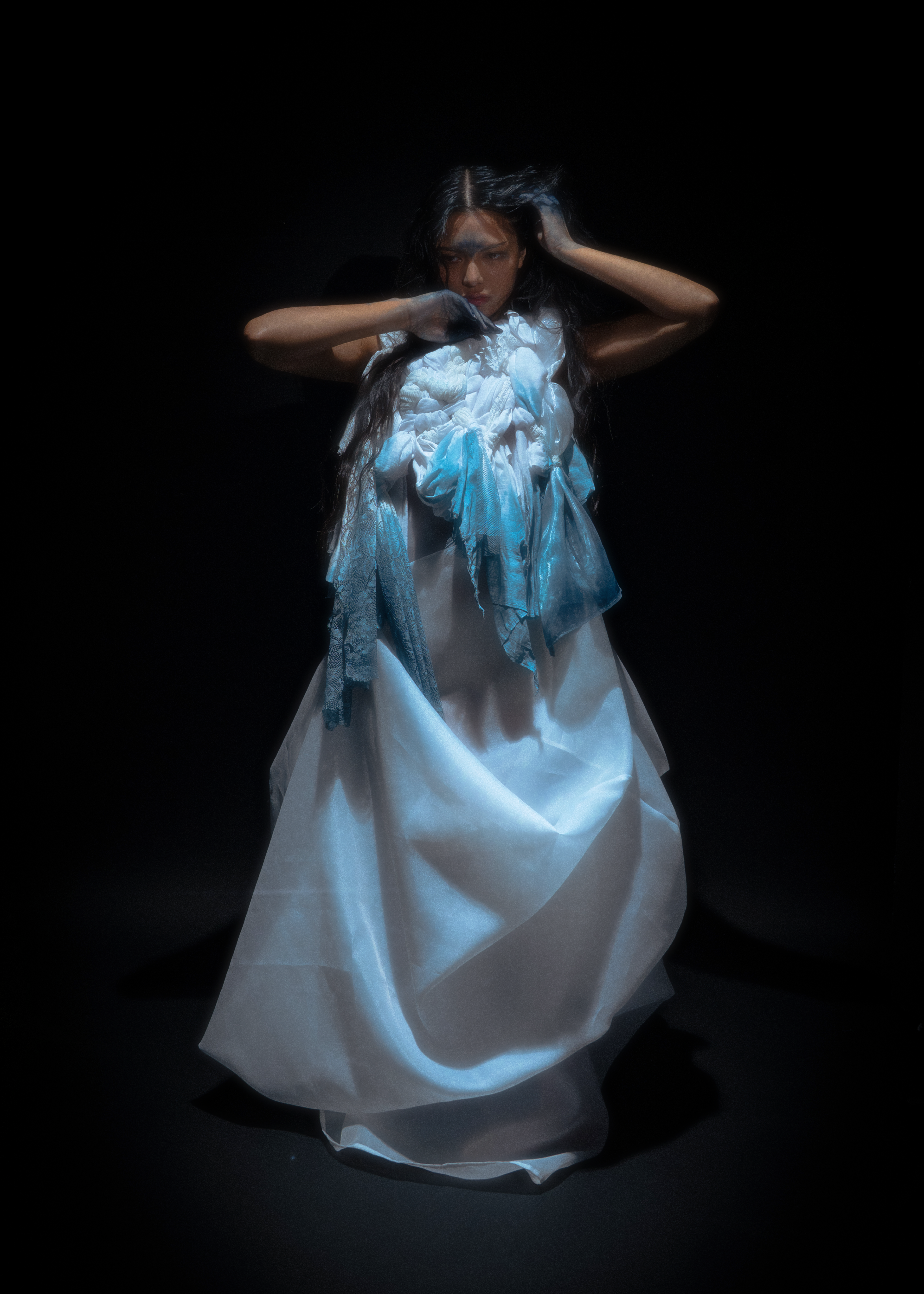 Baud (Wave) Look 1, Acknowledgement of Pain, 2025, Organza dress and knotted vest made from lace, muslin, cotton, organza and jersey; dip-dyed with blue fabric paint.