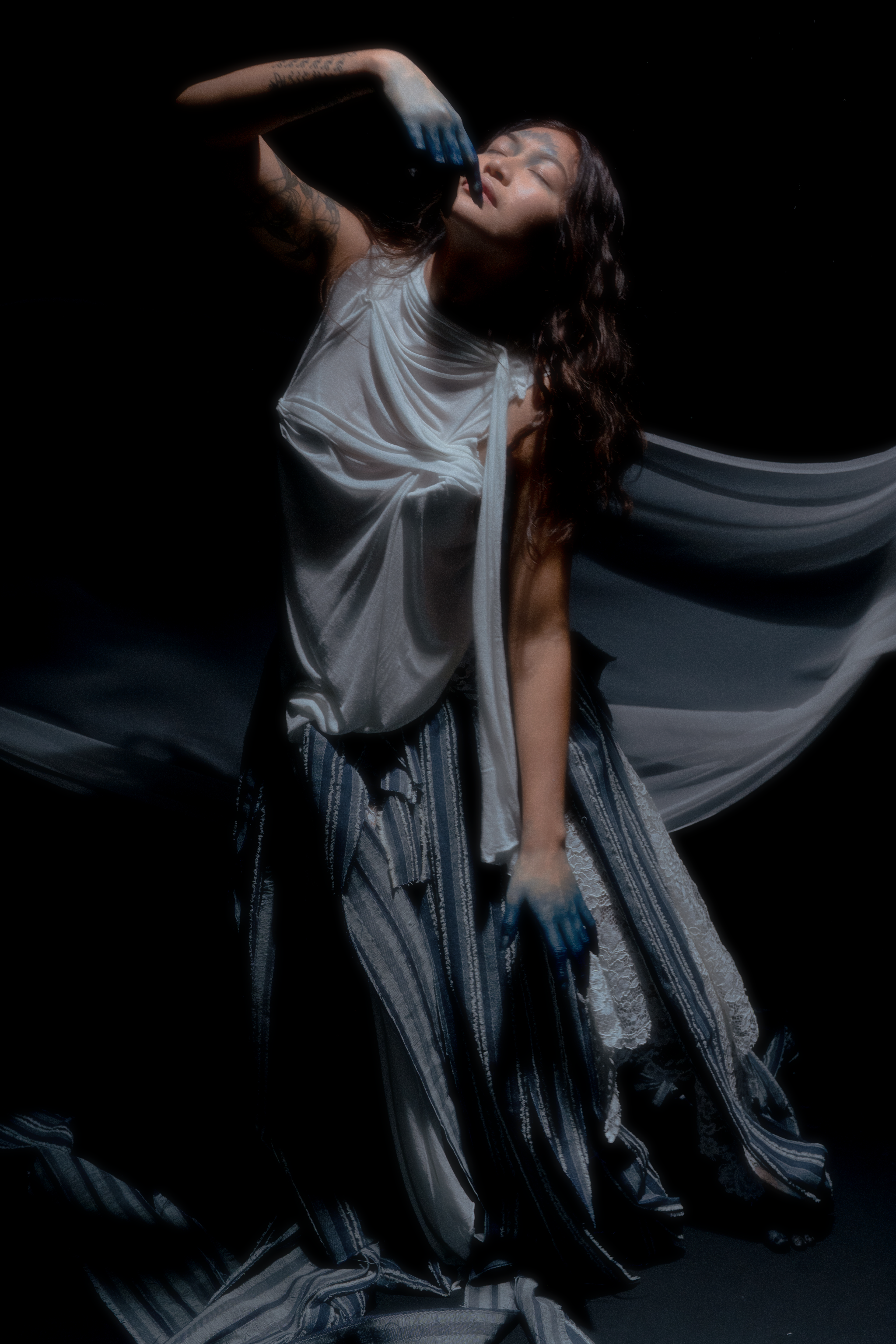 Baud (Wave) Look 2, Breathing Through, 2025, Woven top made from strips of lace, muslin, organza, cotton, and jersey with dip-dyed skirt.