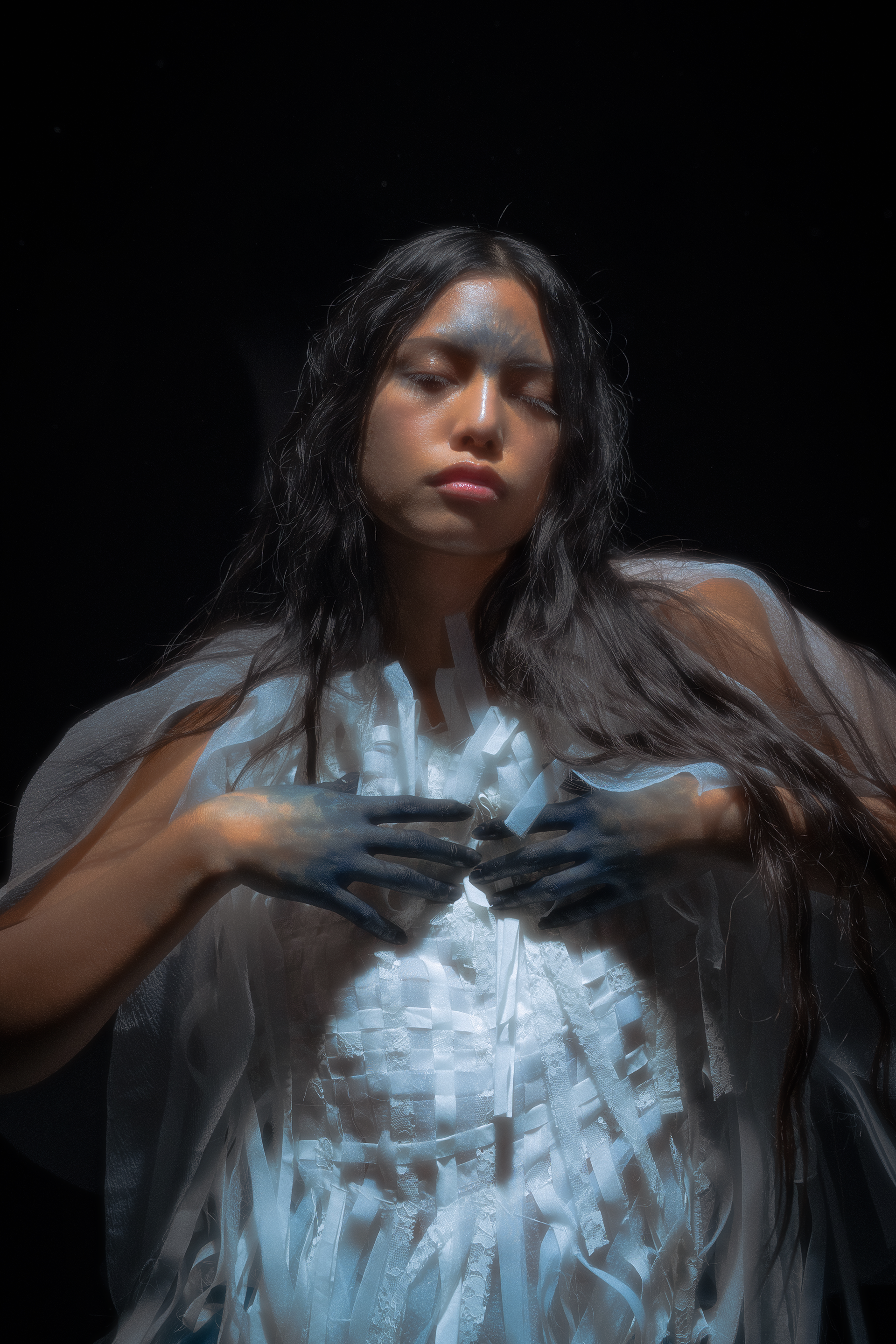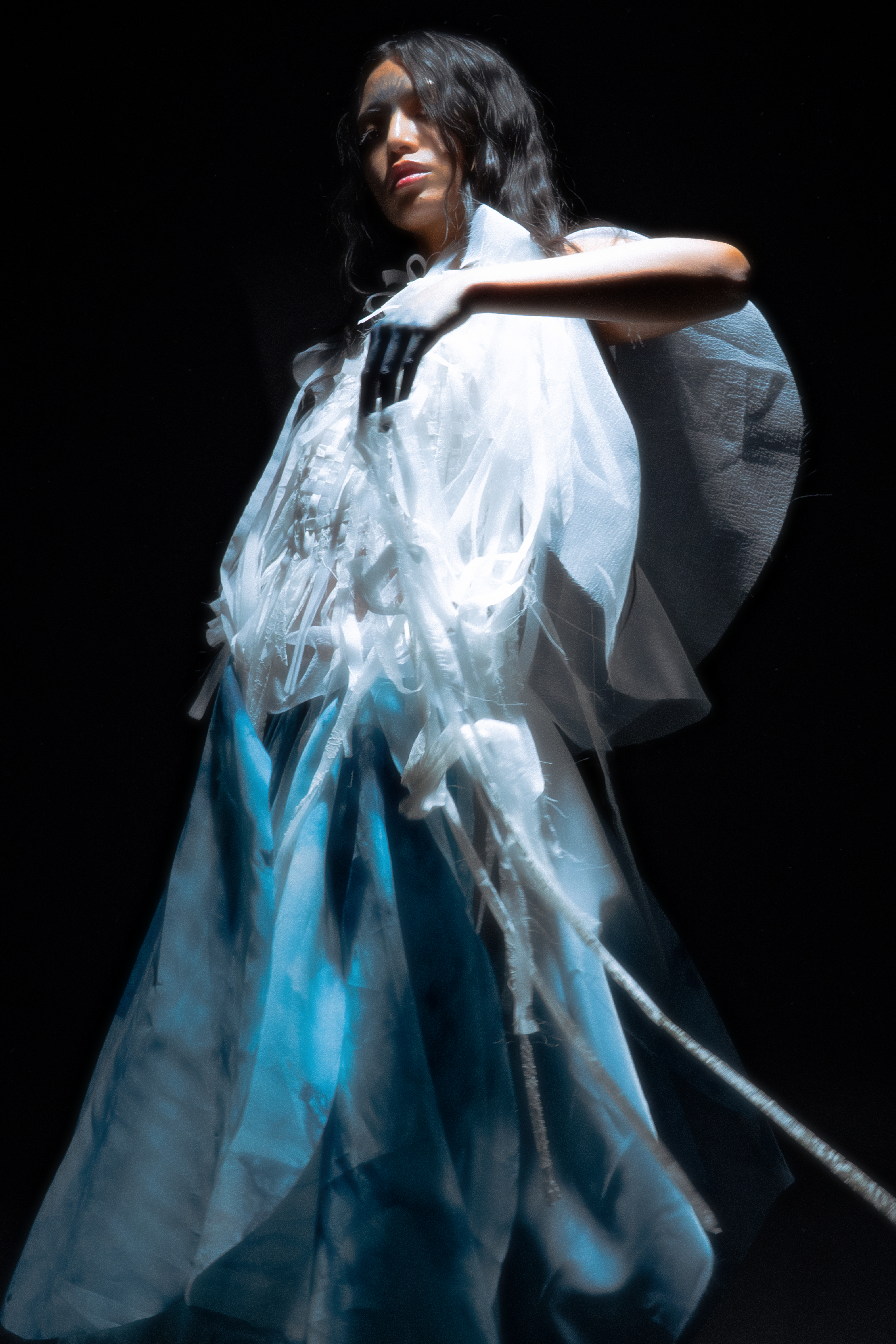 This look reflects the first stage of grief -- the physical weight of emotion and the paralysis that follows. The constricted, knotted form mirrors tension across the body, while the ballooning asymmetric dress expresses the quiet longing to move and breathe again.