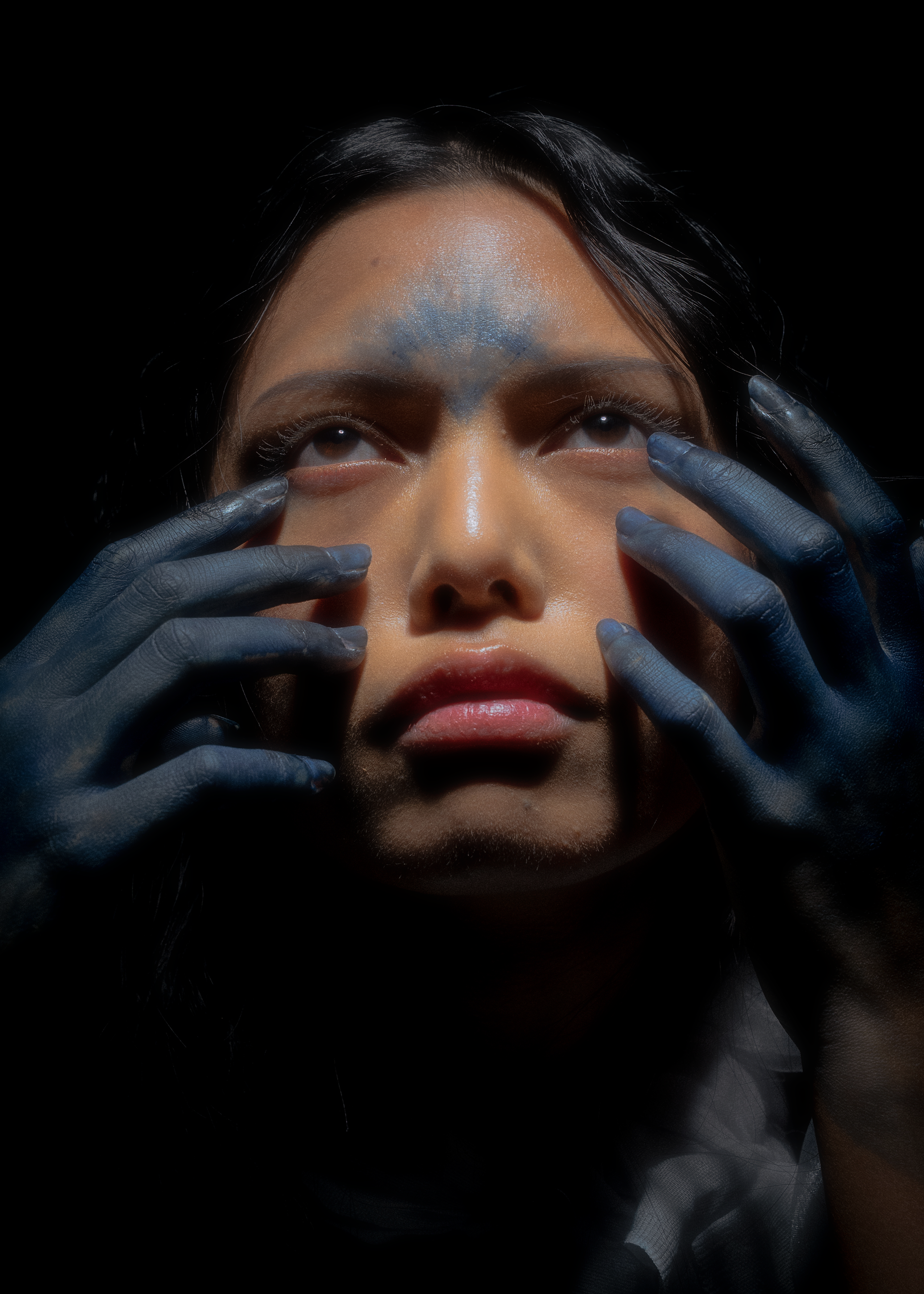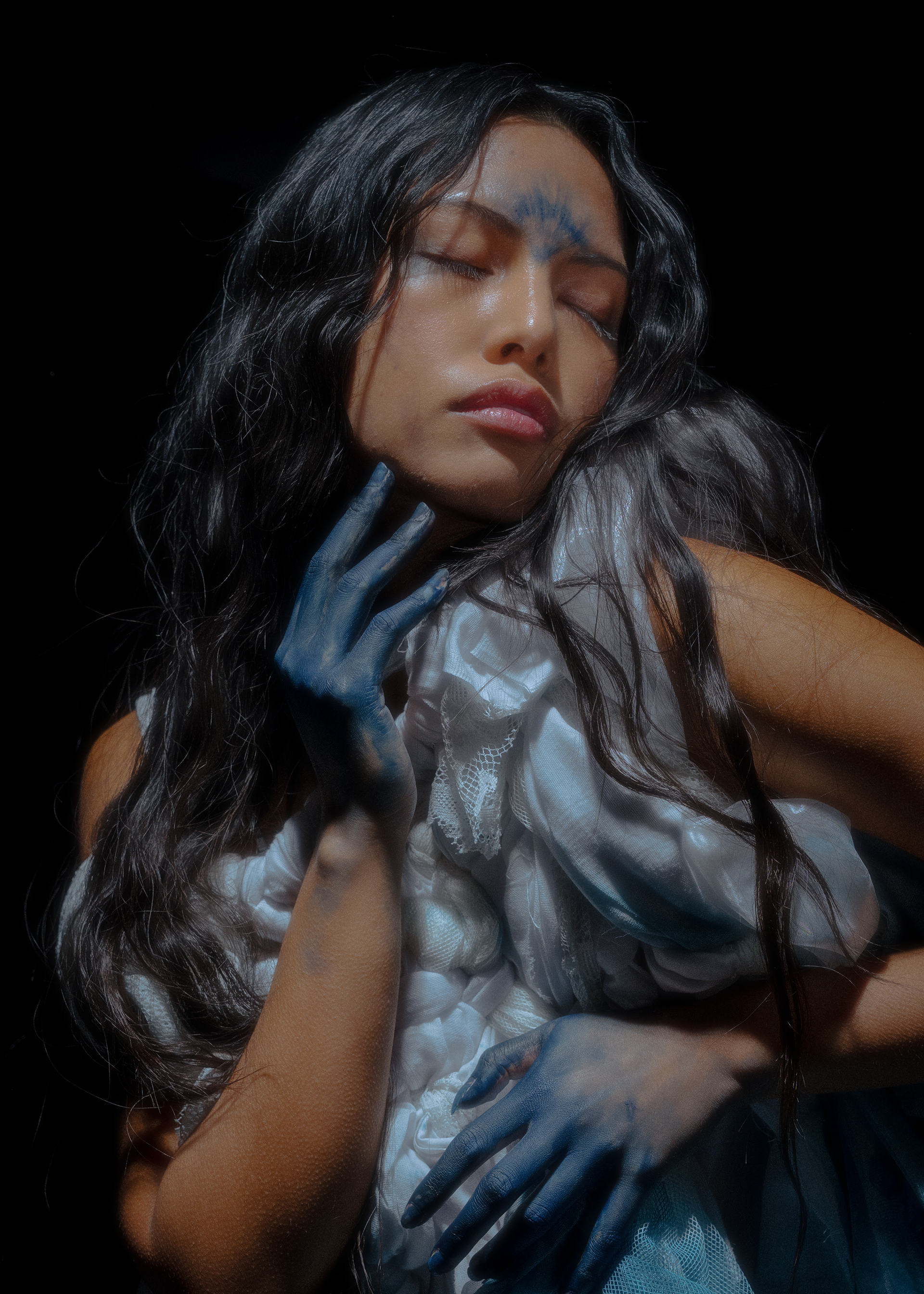 Moments unfold close to the body: the rise of breath, the pulse beneath the fabric, the dip of hands painted in blue -- not stained, but touched and held by water.
