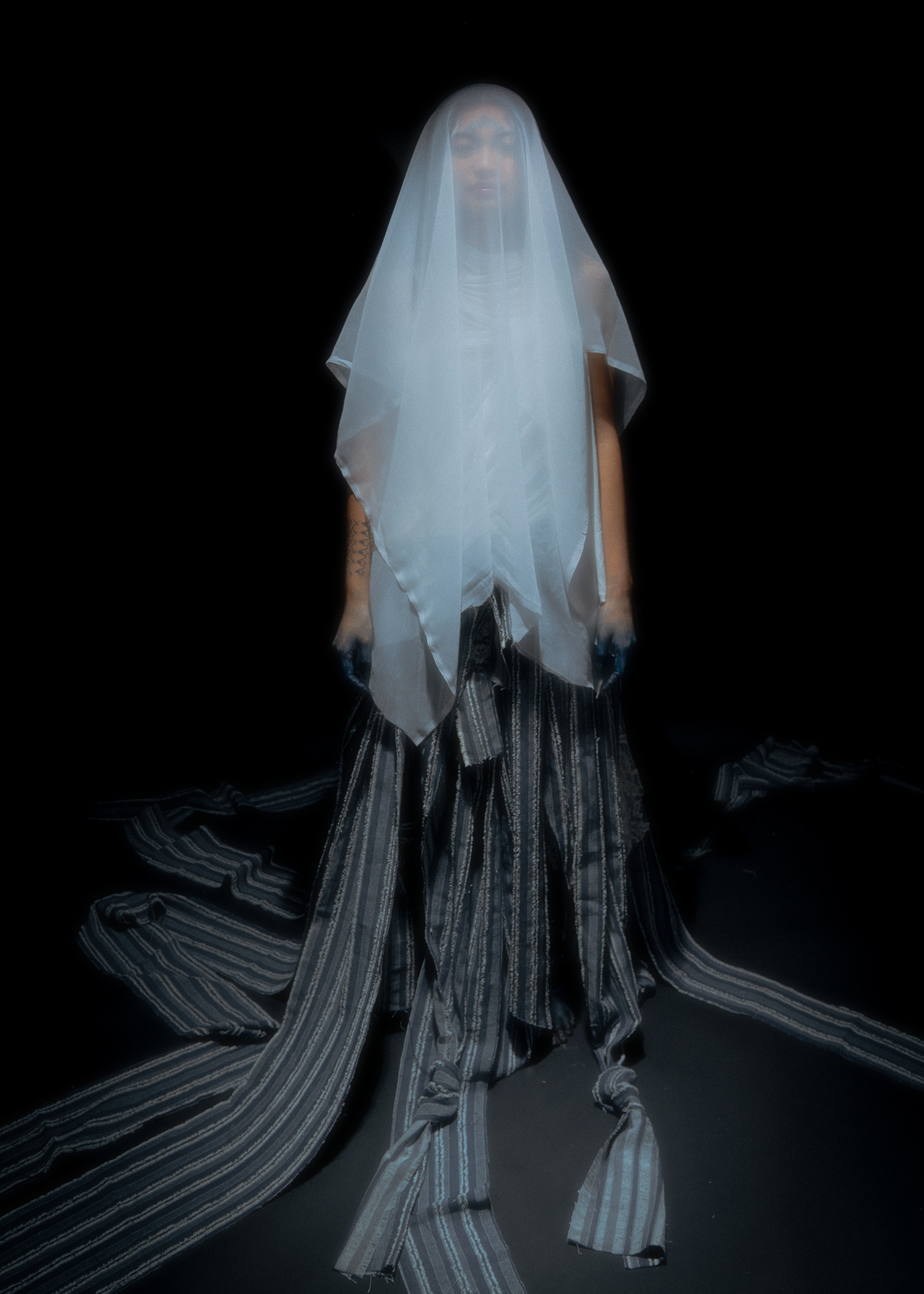 Baud (Wave) Look 3, Return to Oneself, 2025, Lace and striped denim dress with chiffon veil and beaded detailing.