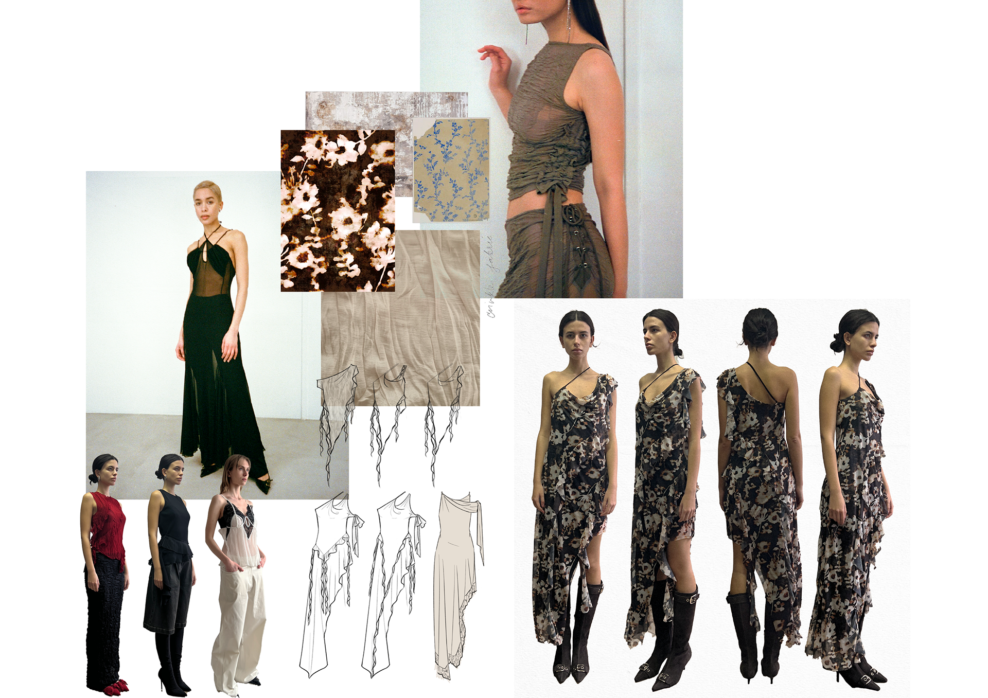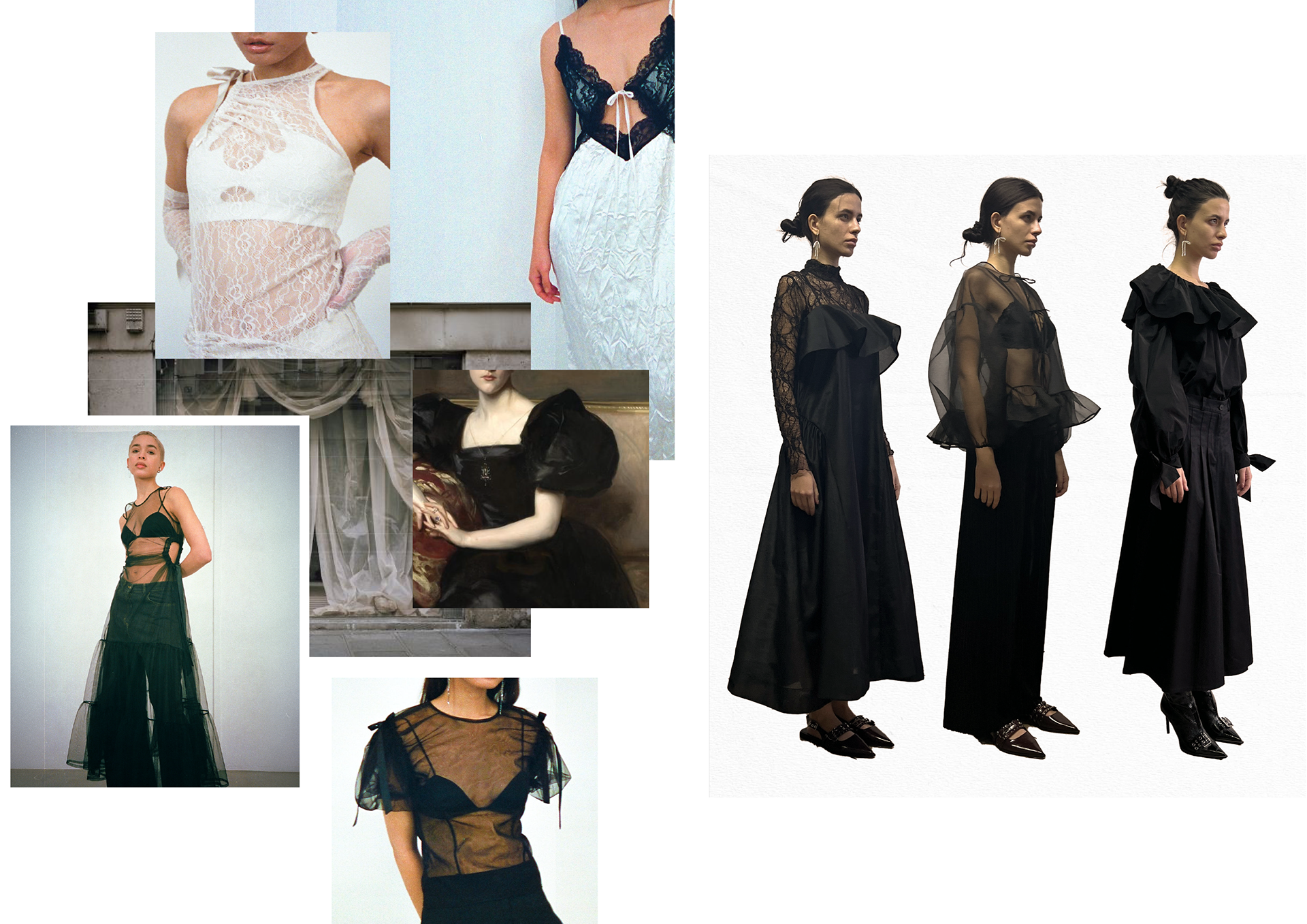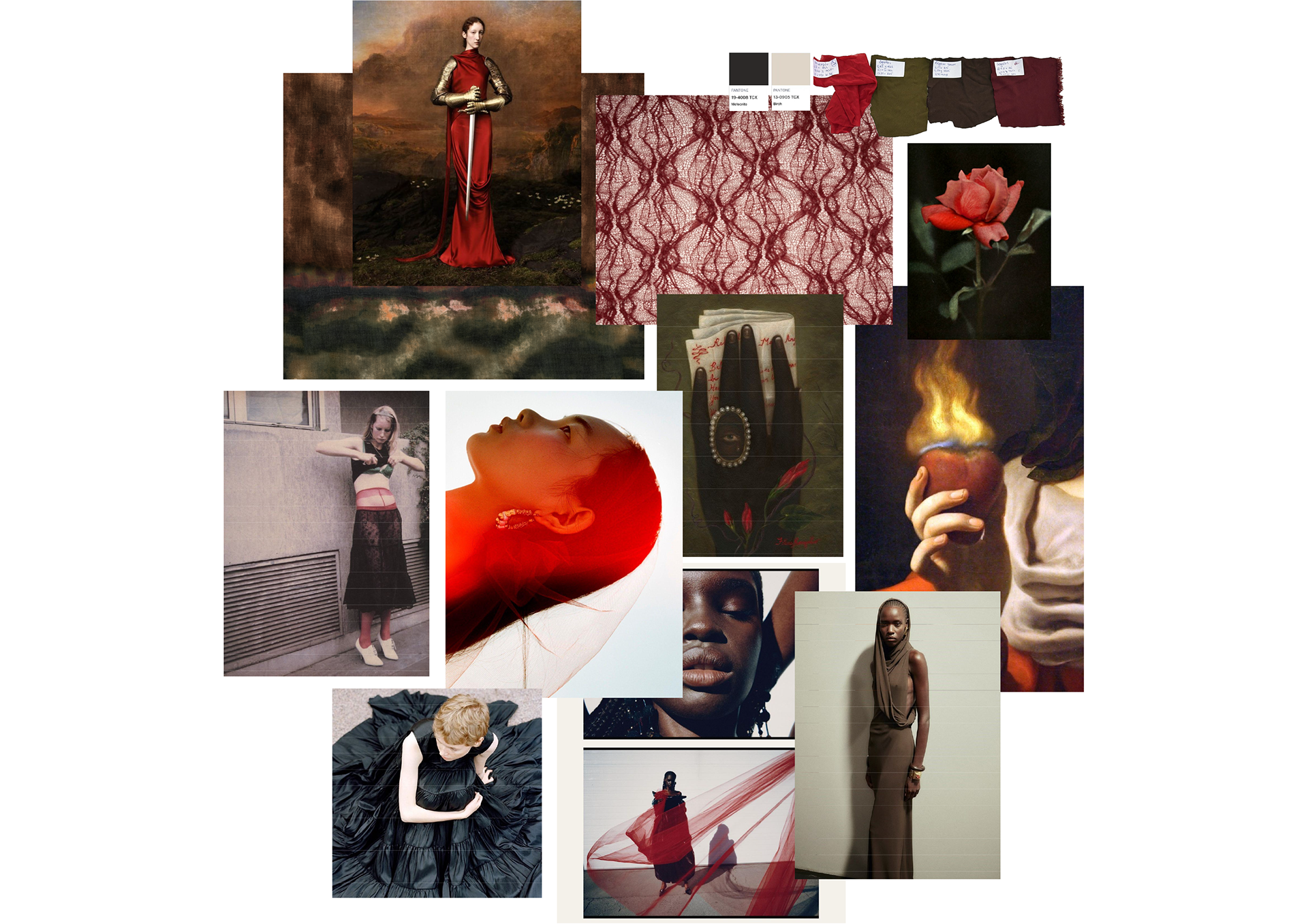 The collection explores contrast: softness and restraint, intimacy and control. Sheer layers, lace textures and sculpted silhouettes echo a sense of vulnerability held within strength. Deep reds, shadowed neutrals and tactile surfaces create a mood that feels cinematic yet grounded.